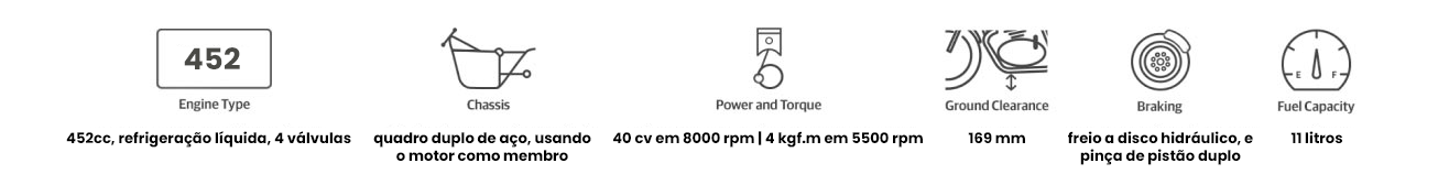 - Tipo: refrigeração líquida, monocilindro, dohc, 4 válvulas